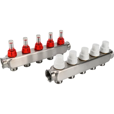 Коллекторная группа DN.ru GC1-31-5 1″ Ду25 Ру10 отводов — 5, в сборе с расходомерами и терморегулирующими клапанами, без переходников, корпус - нержавеющая сталь AISI 304