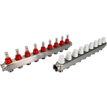 Коллекторная группа DN.ru GC1-31-9 1″ Ду25 Ру10 отводов — 9, в сборе с расходомерами и терморегулирующими клапанами, без переходников, корпус - нержавеющая сталь AISI 304
