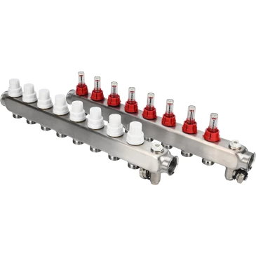 Коллекторная группа DN.ru GC2-31-8 1″ Ду25 Ру10 отводов — 8, в сборе с расходомерами и терморегулирующими клапанами, дренажным краном и воздухоотводчиком, с заглушками, без переходников, корпус - нержавеющая сталь AISI 304