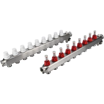 Коллекторная группа DN.ru GC2-31-9 1″ Ду25 Ру10 отводов — 9, в сборе с расходомерами и терморегулирующими клапанами, дренажным краном и воздухоотводчиком, с заглушками, без переходников, корпус - нержавеющая сталь AISI 304