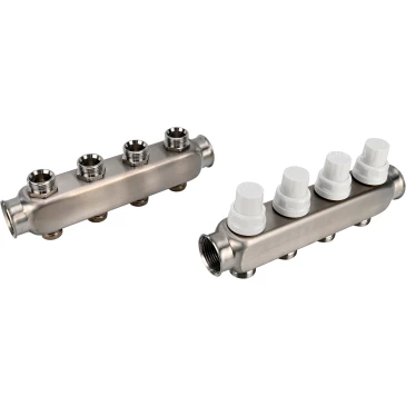 Коллекторная группа DN.ru GC3-31-4 1″ Ду25 Ру10 отводов — 4, в сборе с терморегулирующими клапанами и запорно-балансировочными клапанами, без переходников, корпус - нержавеющая сталь AISI 304