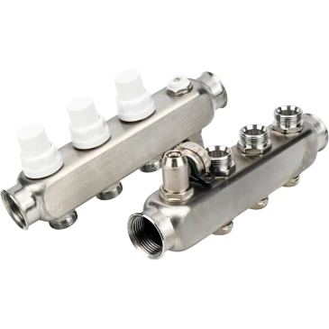 Коллекторная группа DN.ru GC4-31-3 1″ Ду25 Ру10 отводов — 3, в сборе с терморегулирующими клапанами и запорно-балансировочными клапанами, дренажным краном и воздухоотводчиком, с заглушками, без переходников, корпус - нержавеющая сталь AISI 304