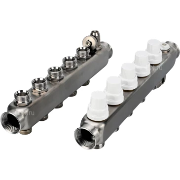 Коллекторная группа DN.ru GC4-31-5 1″ Ду25 Ру10 отводов — 5, в сборе с терморегулирующими клапанами и запорно-балансировочными клапанами, дренажным краном и воздухоотводчиком, с заглушками, без переходников, корпус - нержавеющая сталь AISI 304