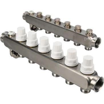 Коллекторная группа DN.ru GC4-31-6 1″ Ду25 Ру10 отводов — 6, в сборе с терморегулирующими клапанами и запорно-балансировочными клапанами, дренажным краном и воздухоотводчиком, с заглушками, без переходников, корпус - нержавеющая сталь AISI 304