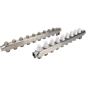 Коллекторная группа DN.ru GC4-31-9 1″ Ду25 Ру10 отводов — 9, в сборе с терморегулирующими клапанами и запорно-балансировочными клапанами, дренажным краном и воздухоотводчиком, с заглушками, без переходников, корпус - нержавеющая сталь AISI 304