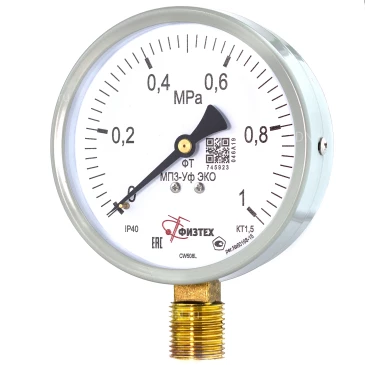 Манометр ФИЗТЕХ МП3-Уф (0-1 МПа) IP40, общетехнический 100мм, исполнение ЭКО, радиальное присоединение, резьба М20х1.5, класс точности 1.5 |