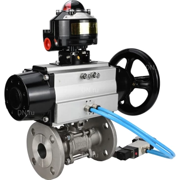 Краны шаровые DN.ru BV3131P(3pc)-FP-F-ISO-H Ду65-100 Ру16-25, трехсоставные полнопроходные фланцевые, нержавеющая сталь SS304, уплотнение - PTFE, с пневмоприводом PA-DA-105-1 двойного действия, с пневмораспределителем 4V320-08 220В, с БКВ APL-510N EX |