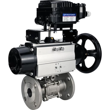 Краны шаровые DN.ru BV3131P(3pc)-FP-F-ISO-H Ду65-100 Ру16-25, трехсоставные полнопроходные фланцевые, нержавеющая сталь SS304, PTFE, с пневмоприводом PA-DA-105-1 двойного действия и электропневматическим поворотным позиционером YT-1000RSN без обратн.связи |