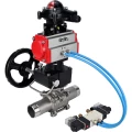 Краны шаровые DN.ru BV3131P(3pc)-FP-W-ISO-H LONG Ду10-150 Ру16-64, полнопроходные, трехсоставные, нержавеющая сталь 304, PTFE, под приварку, с пневмоприводом PA-DA, с пневмораспределителем 4V320-10 220В, БКВ APL-210N, ручным дублером MON