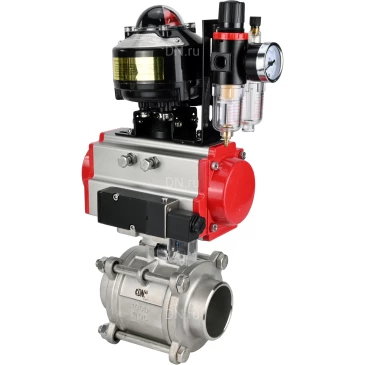 Кран шаровой DN.ru BV3232P(3pc)-FP-W-ISO-H WDVF Ду25 Ру63 полнопроходной, трехсоставной, корпус - нержавеющая сталь 316, уплотнение - PTFE, под приварку, с пневмоприводом PA-DA-052, пневмораспределителем 4М310-08 24В, БКВ APL-510N EX, БПВ AFC2000 |