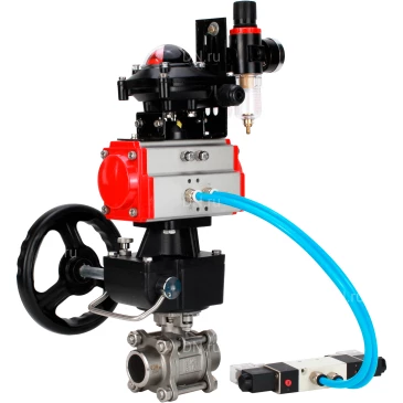 Кран шаровой DN.ru BV3232P(3pc)-FP-W-ISO-H WDVF Ду25 Ру63 полнопроходной, трехсоставной, нерж. сталь 316, уплотнение - PTFE, под приварку, с пн.приводом PA-DA-052, пн.распределителем 4V320-10 220В, БКВ APL-210N, руч. дублером MON1-250-T26-ISO, БПВ AFC2000