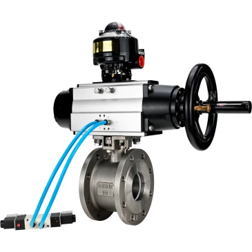 Краны шаровые DN.ru BV3232P-FP-Fb-ISO-H Ду80-100 Ру16, полнопроходные межфланцевые, нержавеющая сталь SS316, уплотнение - PTFE, с пневмоприводом PA-DA-105-1 двойного действия, с пневмораспределителем 4V320-08 220В, с БКВ APL-510N EX