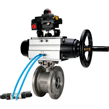 Краны шаровые DN.ru BV3232P-FP-Fb-ISO-H Ду80-100 Ру16, полнопроходные межфланцевые, нержавеющая сталь SS316, уплотнение - PTFE, с пневмоприводом PA-DA-105-1 двойного действия, с пневмораспределителем 4V320-08 220В, с БКВ APL-410N EX