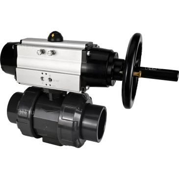 Краны шаровые DN.ru BV4242E-FP-GRM-ISO Дн15-100 Ру10 полнопроходные, корпус - НПВХ, шар - НПВХ, уплотнение - EPDM, с пневмоприводом PA-DA-105-1 двойного действия со штурвалом