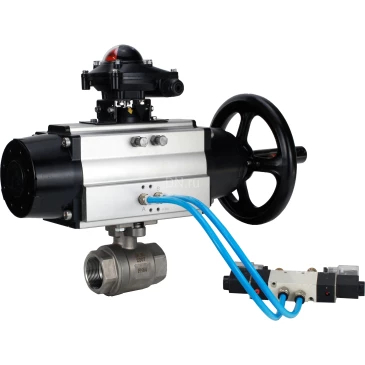 Краны шаровые DN.ru BV3232P(2pc)-FP-T-ISO-H Ду80 Ру40, полнопроходные муфтовые, нержавеющая сталь SS316, уплотнение - PTFE, с пневмоприводом PA-DA-105-1 двойного действия, с пневмораспределителем 4V320-08 220В, с БКВ APL-210N |