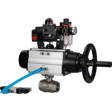 Краны шаровые DN.ru BV3232P(2pc)-FP-T-ISO-H Ду80 Ру40, полнопроходные муфтовые, нержавеющая сталь SS316, уплотнение - PTFE, с пневмоприводом PA-DA-105-1 двойного действия, с пневмораспределителем 4V320-10 220В, с БКВ APL-410N EX, с БПВ AFC2000 |