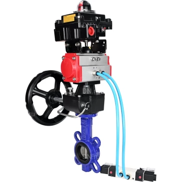 Затвор дисковый поворотный для абразивных сред DN.ru WBV1632E-2W-Fb-H Ду80 Ру16, корпус - чугун QT450, диск - нерж.сталь 316L, EPDM, с пн.приводом PA-DA-065, пн.распред. 4V320-10 220В, дублером MON1-250-T26-ISO, БКВ APL-410N-EX