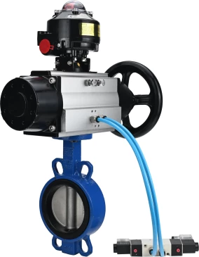 Затворы дисковые поворотные DN.ru WBV3432N-2W-Fb Ду150 Ру16, корпус - углеродистая сталь WCB, диск - нержавеющая сталь 316L, уплотнение - NBR, с пневмоприводом PA-DA-105-1 двойного действия, с пневмораспределителем 4V320-10 220В, с БКВ APL-510N-EX